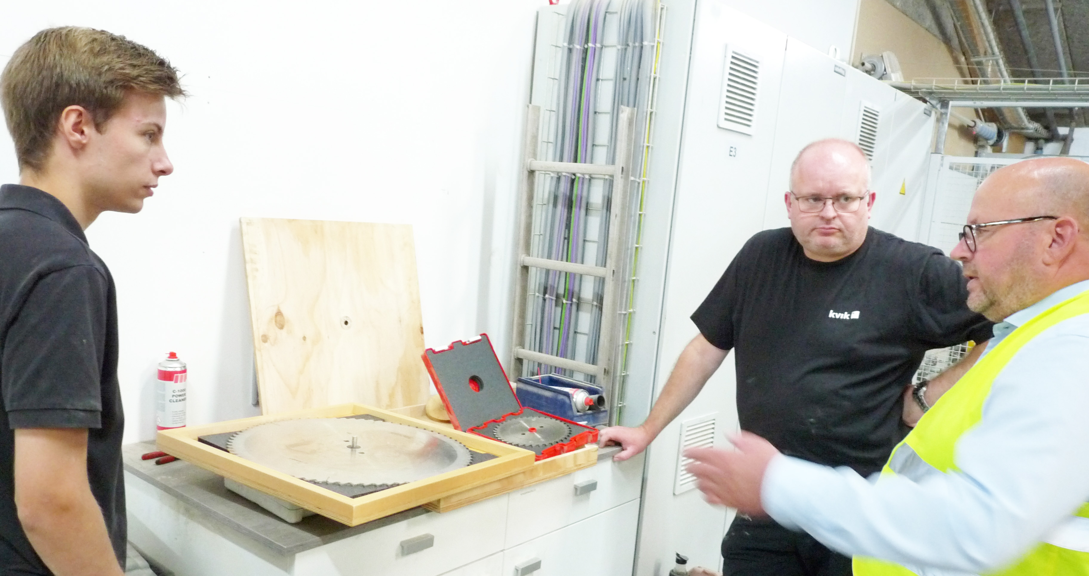 Udskiftningen af de mange bor er således et led i den kontinuerlige procesoptimering, som finder sted hos Kvik. Her står tiden nemlig ikke stille. De tre herrer er da også i gang med at se på flere nye værktøjstiltag, som de endnu ikke er klar til at afsløre. Dagens besøg slutter ved den store pladesav, hvor der debatteres livligt om diaklingerne (Ø520) til opskæringsanlægget. Klinger som i dag performer med en standtid på 25 - 30.000 m afhængig af spånpladekvaliteten.